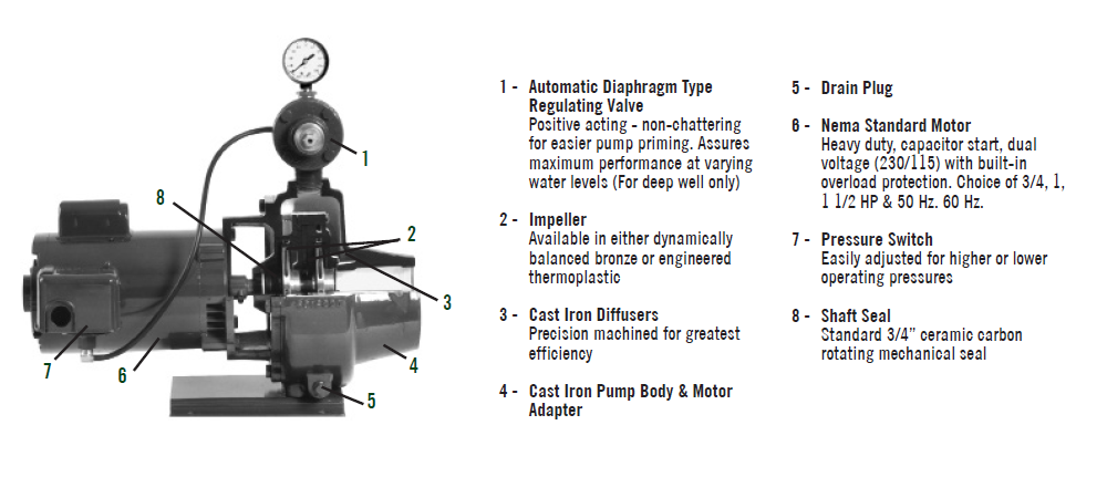 Baker offers a full line of shallow well, convertible, and multi-stage jet pumps built for years of trouble free operation, with high-efficiency impellers and diffusers. The 1500 series shallow well capacity is up to 40 gallons per minute (GPM) and pressures to 100 PSI.