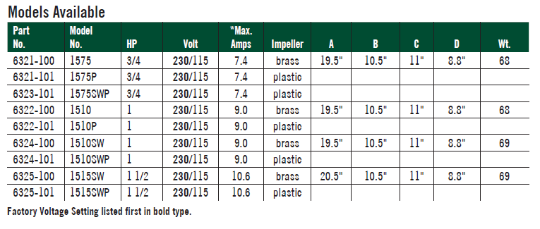 All 1500 Series Multi-Stage Pumps come with a 1 1/4" suction pipe and a 1" discharge. The sizes range from 3/4 to 1 1/2 horsepower (HP).