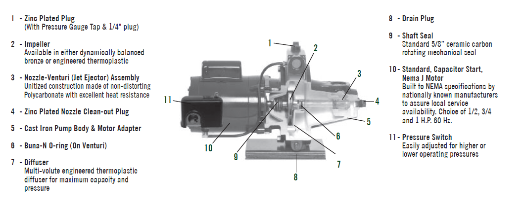 All 8100 Series Shallow Well Pumps come with a 1 1/4" suction pipe and 1" top or side discharge. The sizes range from 1/2 to 1 horsepower (HP).