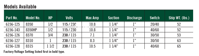 Available in 1/2, 3/4, 1, and 1 1/2 HP, these pumps also offer flows of up to 32 gallons per minute (GPM). The E-Series Jet Pump is designed with a 1 1/4" inlet and 1" outlet while allowing for an easy switch between 115V and 230V.