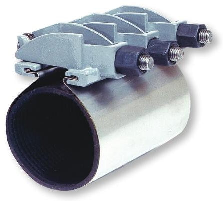 • Multi-Band Clamp (14 in–30 in): Ships "in the flat" — bands are not pre-formed to the pipe radius. Reduces storage space, cuts installation time, and provides twice the adjustment range of a single-band clamp.